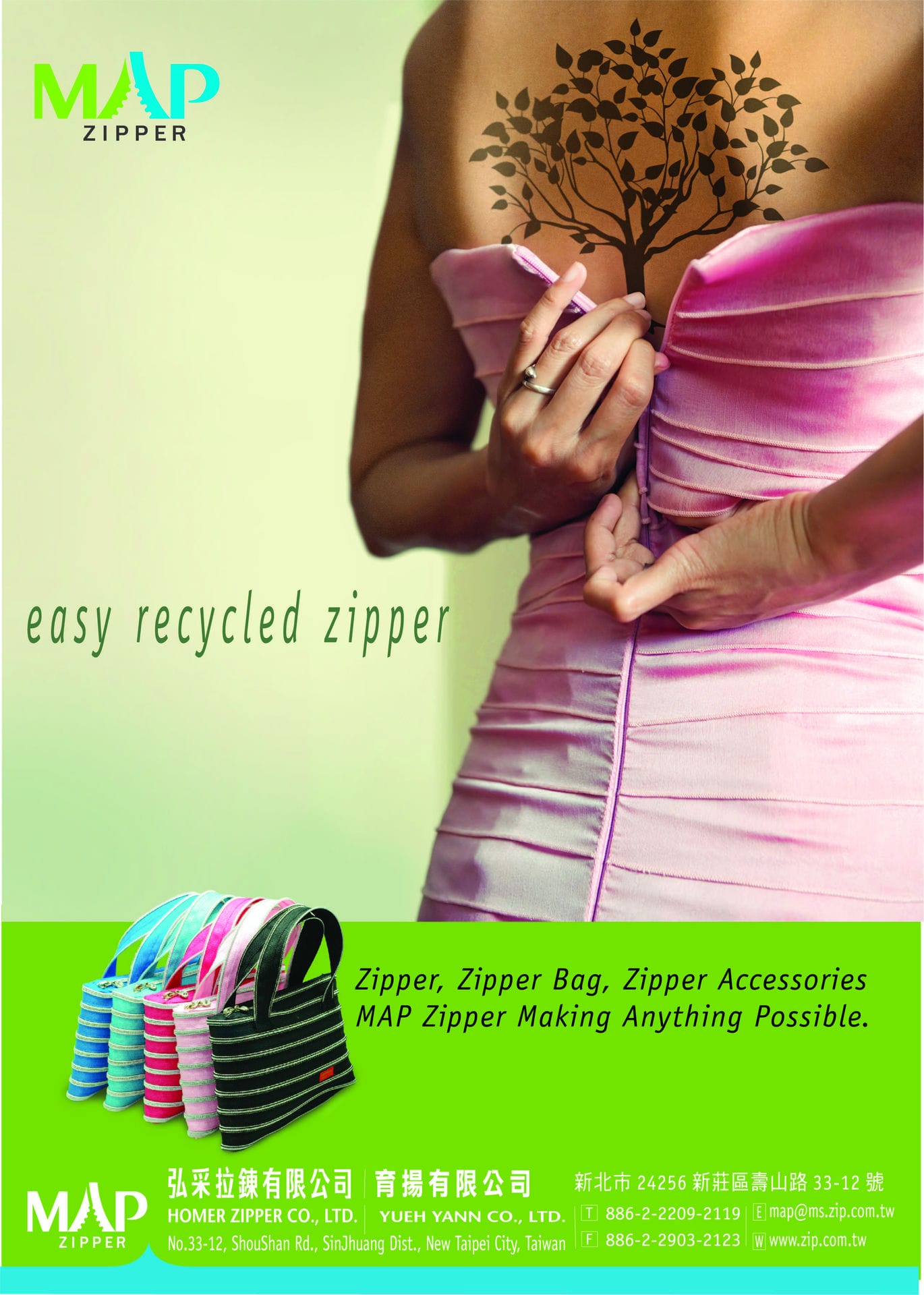 當拉鍊能與產品材質搭配時將能達到易餘回收再使用的狀況,為地球環境減少一份廢料,也減少一份原料的使用,也讓材料能夠2次甚至多次的再利用.